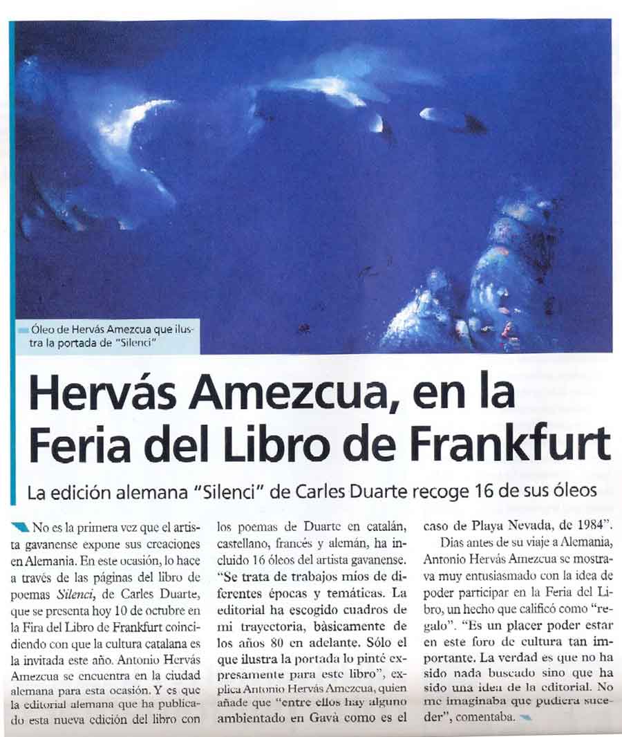| Exposición en la Feria del Libro de Frankfurt (Alemania). Presentación del libro de poemas El silenci de Carles Duarte i Montserrat, Ilustrado con pinturas de Antonio Hervás. La editorial alemana Buchholz inicia su singladura con este libro, en catalán como versión original y con traducción al castellano, francés y alemán | |