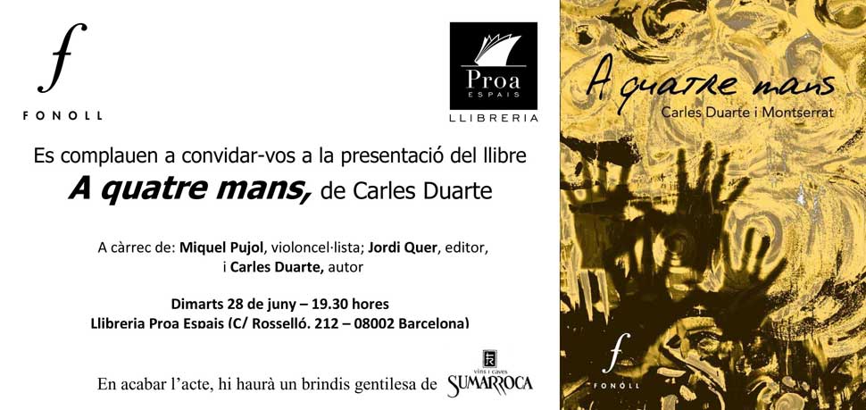 Poemas de Carles Duarte y grabados de Antonio Hervás. Publicado por Pagès Editors. La presentación correrá a cargo de Jordi Julià, profesor de la UAB Sala Social del Cercle Artistic de Sant Lluc. C/ Mercaders 42, Barcelona 12 de mayo de 2009 a las 19:30 horas |