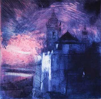 < Sitges al anochecer Grabado al aguafuerte aguatinta y puntaseca Plancha de cobre 12x12. Papel hecho a mano |