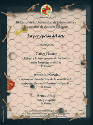 La percepción del arte sesión de clausura del curso organizado por la Universidad de Jaén. Intervienen: Carles Duarte Diálogo y la transgresión de los límites entre lenguajes artísticos 19 de febrero de 2013 Antonio Hervás La asimilación subjetiva de la obra de arte: confrontación entre el artista y el público 20 de febrero de 2013 Arnau Puig Arte y empatía 21 de febrero de 2013 Las intervenciones tendrán lugar a las 17:00 horas en la sede de la Fundación Cesáreo Rodríguez Aguilera. Campus Las Lagunillas s/n, edificio B2 1ª planta, Jaén. |