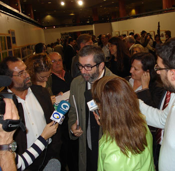 | Abajo: momentos de la inauguración. El autor con los escritores Antonio Muñoz Molina y Elvira Lindo | |