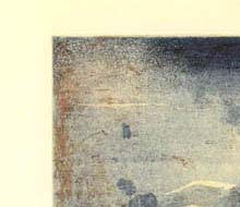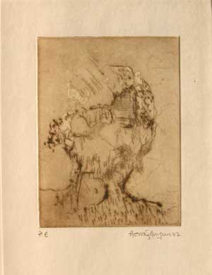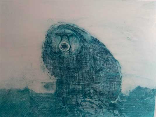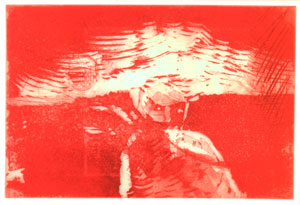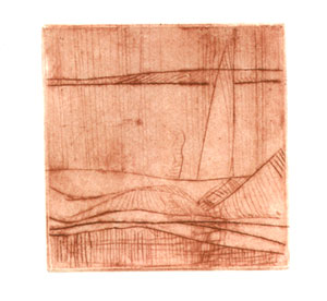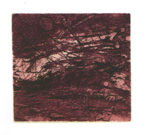 | Veles. Punta seca. Plancha de zinc de 10x10 cm. Tirada: 50 ejemplares. 1997. | Pequeño cielo. Aguafuerte-aguatinta. Plancha de cobre de 8x8 cm. Tirada: 20 ejemplares. 1992. |