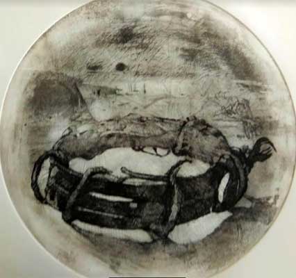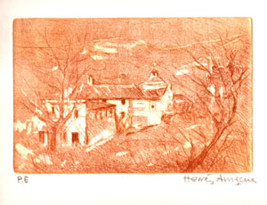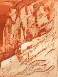| Garraf roig. Aguafuerte-aguatinta. Plancha de cobre de 32x48,5 cm. Tirada: 25 ejemplares. 2003. | Ermita. Museo de la Vida Rural. L'Espluga de Francolí, Tarragona. |