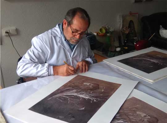 | Todo lenguaje plástico deriva o se sujeta a una técnica, como vehículo de expresión propia y diferenciadora. Pero, más que cualquiera otra, la técnica del grabador ofrece al artista poder aprehender el disfrute de la labor artesanal, en el sentido prerrafaelita del término. | |||||