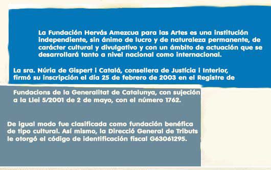 La Fundació Hervás Amezcua per a les Arts, registrada com a entitat jurídica amb el número 1762 al Reg. de Fundacions de la Generalitat de Catalunya l’any 2003, acompleix la Llei 19/2014 del 29 de desembre, de transparència, accés a la informació pública i bon govern